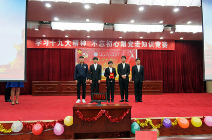 本次競賽分為必答題、搶答題、風(fēng)險題三個環(huán)節(jié),題庫準(zhǔn)備了1000道考題,內(nèi)容涵蓋了十九大、新黨章黨規(guī)黨紀(jì)、習(xí)近平系列重要講話等相關(guān)知識點(diǎn)。各代表隊參賽選手使出渾身解數(shù),冷靜作答,密切配合,氣氛活躍而緊張,上演了一場精彩紛呈的黨建文化盛宴。競賽現(xiàn)場精彩紛呈,高潮迭起,選手們既有毫不猶豫的快速回答,也有充分商討后的沉著應(yīng)答,展現(xiàn)了他們豐富的知識積累和敏捷的思辨能力。在工作人員統(tǒng)計分?jǐn)?shù)的間隙,主持人與現(xiàn)場學(xué)生進(jìn)行了互動,把難度較大的風(fēng)險題拋給大家搶答,有7位同學(xué)獲得了現(xiàn)場搶答獎勵——《習(xí)近平系列重要講話讀本》。