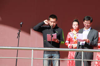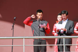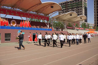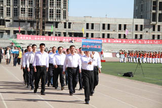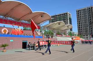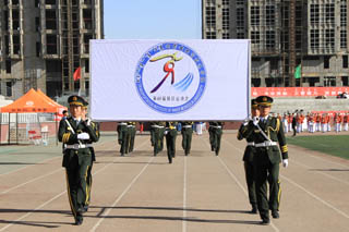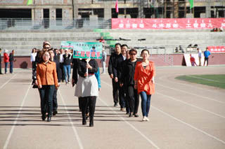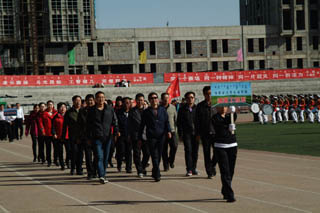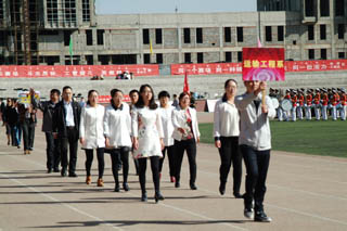 開幕式由黨政辦公室主任胡利春主持,在雄壯高昂的運動員進行曲中,各系學生和教工方隊,機關(guān)、教輔單位職工方隊,步伐矯健,口號響亮,依次走過主席臺接受檢閱。隆重的入場式后,開幕式舉行了莊嚴的升國旗儀式,在嘹亮的國歌聲中,五星紅旗冉冉升起。