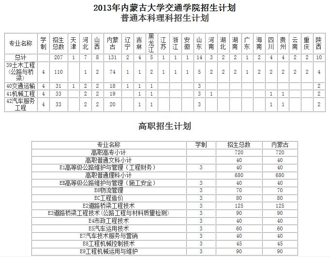 2013年內(nèi)蒙古大學(xué)交通學(xué)院招生計(jì)劃 普通本科理科招生計(jì)劃