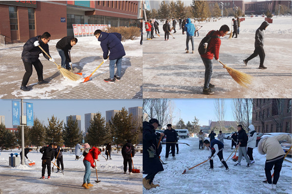 今冬呼和浩特的初雪在上周末如約而至,校園內(nèi)銀裝素裹,分外妖嬈,白雪覆蓋了整個校園,為校園平添了新的色彩,但同時校園道路積雪也給師生出行帶來了安全隱患。為盡快消除積雪影響,方便師生出行,方便師生出行,12月2日上午,學(xué)院團委、就業(yè)指導(dǎo)中心組織學(xué)生會、就業(yè)創(chuàng)業(yè)促進會、國旗班、軍樂團、心理健康教育中心等部分學(xué)生干部和卓越工程師班的同學(xué)們開展義務(wù)掃雪活動。