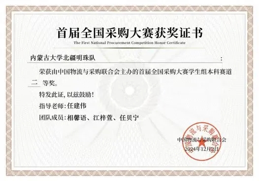 2024年12月1-2日,中國(guó)物流與采購(gòu)聯(lián)合會(huì)主辦,深圳交易集團(tuán)有限公司和中國(guó)石油物資有限公司承辦,深圳交易研究院有限公司和北京物資學(xué)院共同協(xié)辦的首屆全國(guó)采購(gòu)大賽決賽及頒獎(jiǎng)典禮在深圳舉行。由我院運(yùn)輸工程系任建偉教授指導(dǎo),相馨語(物流2202班)、江梓萱(物流2202班)、任貝寧(物流2202班)組成的“北疆明珠隊(duì)”榮獲全國(guó)二等獎(jiǎng)。